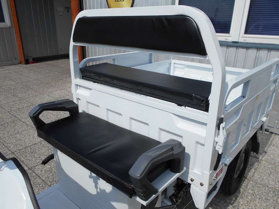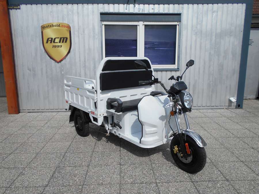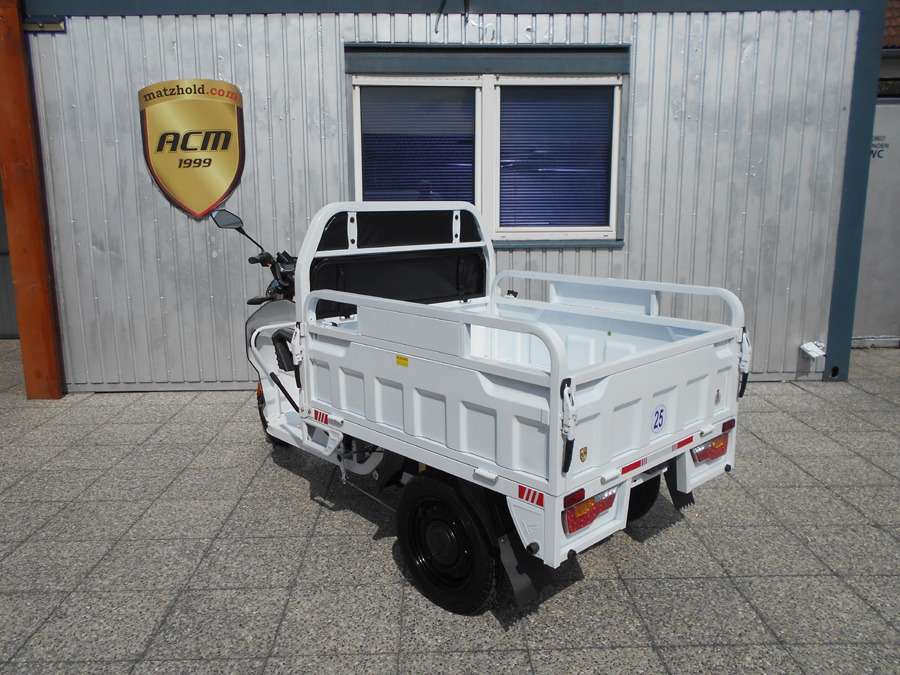 25 km/h = Anmeldefrei! LxBxH: 2,66 x 1,18 x 1,35 m Ladefläche: 1,25 x 1,05 m Wände: 330 mm Höhe Eigengewicht: 220 kg Zuladung: 305 kg Gesamtgewicht: 525 kg Antrieb: Elektro mit 600W / 60V (ungedrosselt 1100W) Scheibenbremsen vorne Trommelbremsen hinten Bereifung: v 3.5-12, h: 3.75-12 Batterie: 5 x 45 Ah Ladezeit: 6 – 8 Stunden Reichweite: 55 km Topspeed: bis zu 25 km/h Steigfähigkeit: 20% Leer, 12% voll beladen