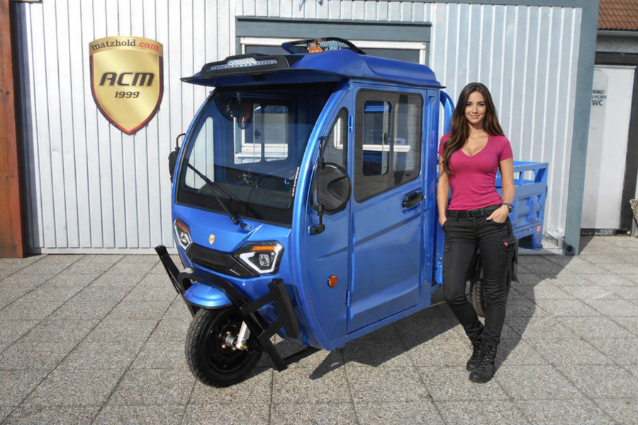 Umwelt- und Klimafreundlicher Transport! Geländegängig, eine große Kabine sowie ein Pritschenaufbau machen das Einsatzgebiet des Elektro-Lastendreirads fast unendlich.