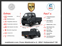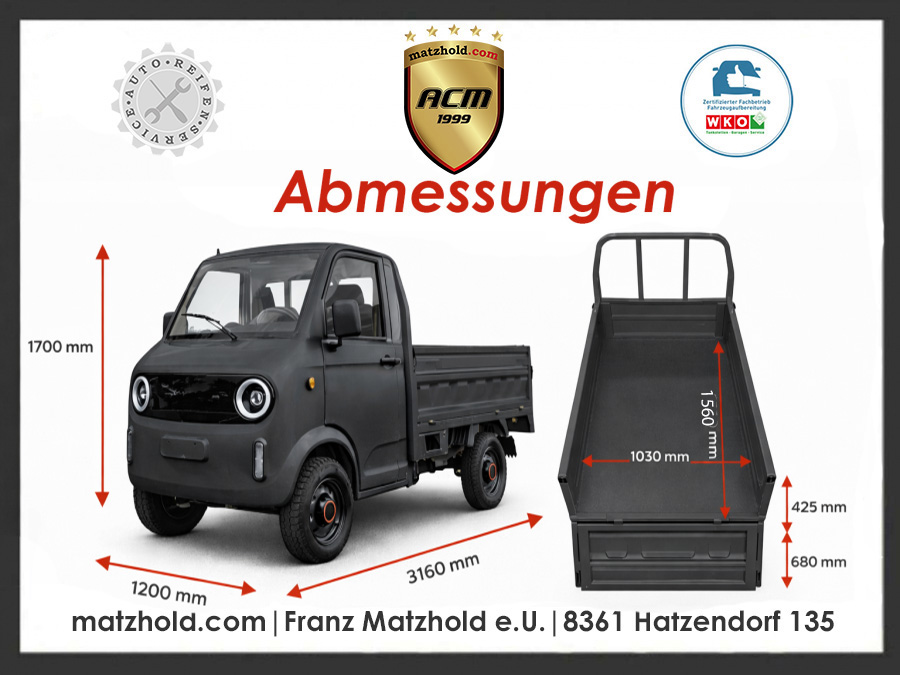 Entdecken Sie die neue Art der Mobilität: 100 % elektrisch, 100 % praktisch, 100% Style! Unser moderner E-Truck verbindet umweltbewusstes Fahren mit hoher Alltagstauglichkeit – ideal für Unternehmer, Gemeinden, Landwirte oder als wettergeschütztes Zweitfahrzeug.