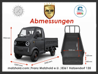 LxBxH: 3,16 x 1,20 x 1,70 m Radstand: 1,86 m Ladefläche L: 1,56 m Ladefläche B: 1,03 m Bordwand Höhe: 42,5 cm Höhe Kante Ladefläche: 68 cm