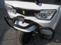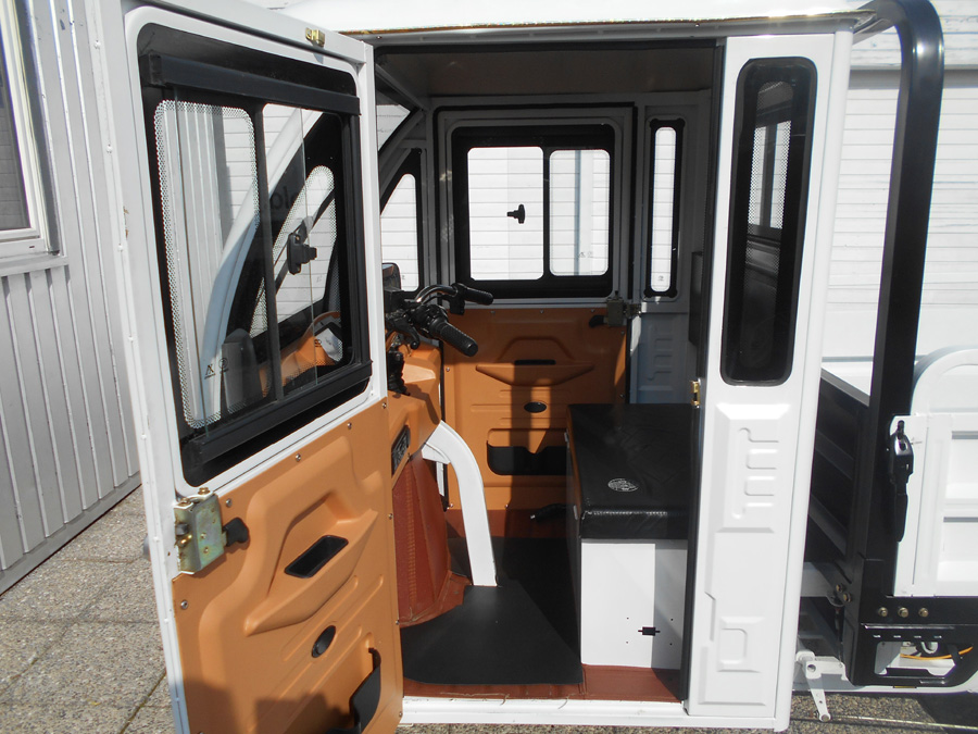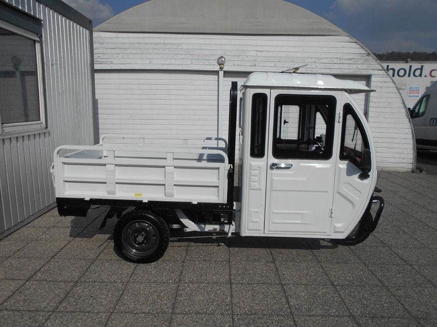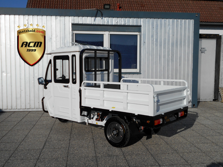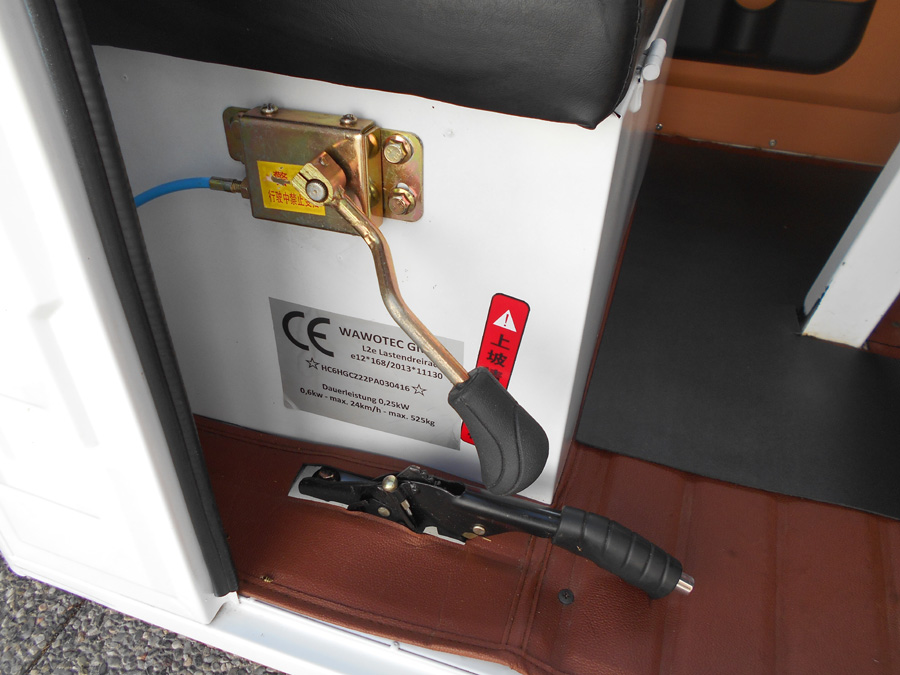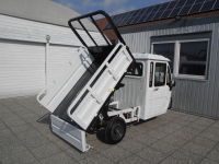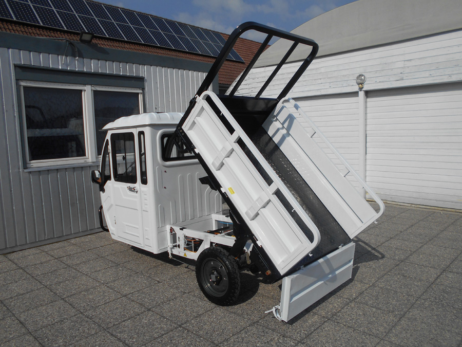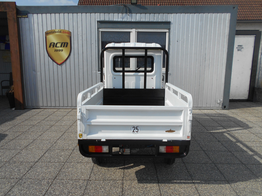 25 km/h = Anmeldefrei! LxBxH: 2,95 x 1,18 x 1,78 m Ladefläche: 1,42 x 1,02 m Eigengewicht: 220 kg Zuladung: 305 kg Gesamtgewicht: 525 kg Antrieb: Elektro 60V Scheibenbremse vorne Trommelbremsen hinten Bereifung: v 3.5-12, h: 3.75-12 Batterie: 5 x 45 Ah Ladezeit: 6 Stunden Reichweite: ~ 50 km Topspeed: bis zu 25 km/h Steigfähigkeit: 20% Leer, 12% voll beladen